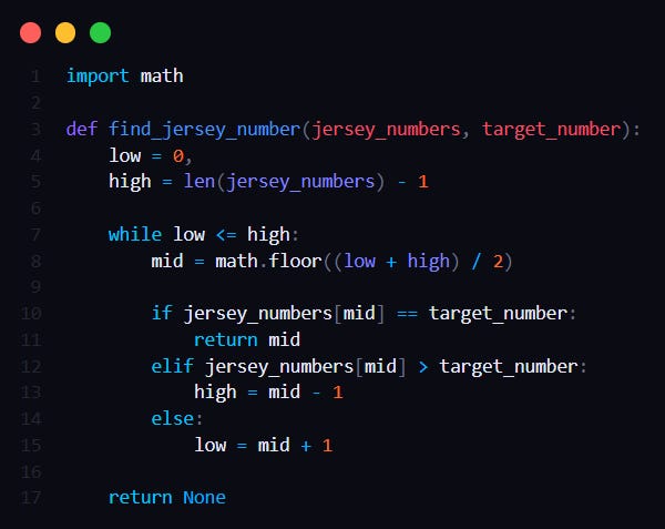 Let's explore a practical example in Python inspired by my passion for basketball. Imagine you have a sorted list of basketball players' jersey numbers: [8, 13, 23, 34, 44, 55, 77]. Your goal is to find the jersey number 23 (for obvious reason's 🐐) using binary search.